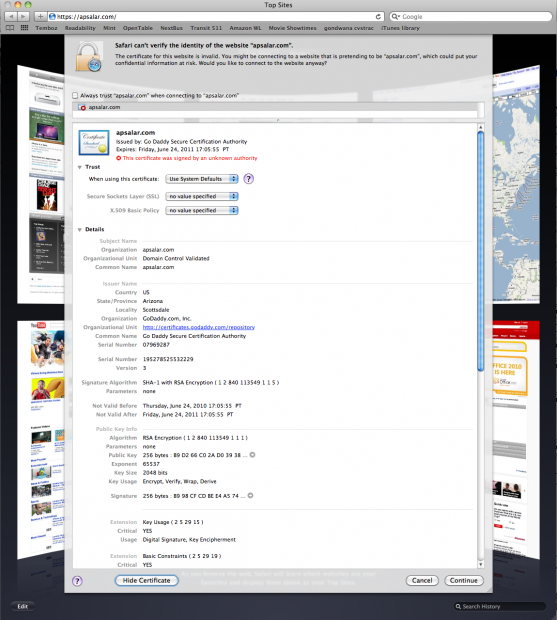 Immediately after switching from my earlier “snake oil” self-signed test certificate to the production certificate, I saw SSL errors on Google Chrome for Mac and Safari for Mac, i.e. the two browsers that use OS X’s built-in crypto and certificate store. I suppose I should have tested the certificate on another server before going live, but I trusted GoDaddy (they are my DNS registrars, and competent, if garish).
